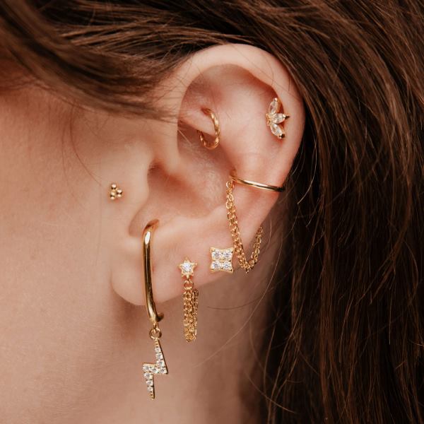 Estella je igriv in privlačen uhan, ki vedno pusti svoj pečat. Manjša zvezda z diamantom v sredini je s spodnjim delom povezana z dvema verižicama, ki sta čudovit modni detajl. Uhan je na voljo kot en kos in je primeren za kombiniranje z vsemi drugimi uhani.