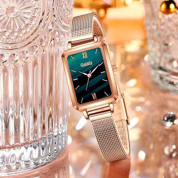 Ta ura ima sijočo rožnato-zlato barvo in čudovito zeleno številčnico. Dodaja stil vsaki obleki, kavbojkam ali formalni obleki.