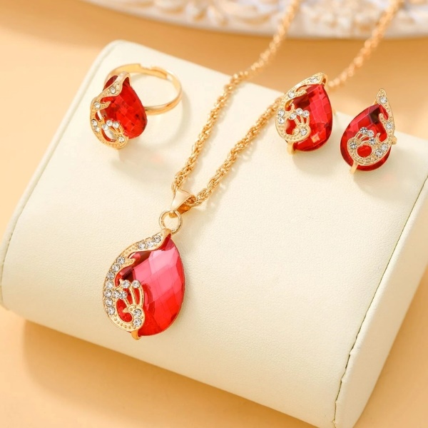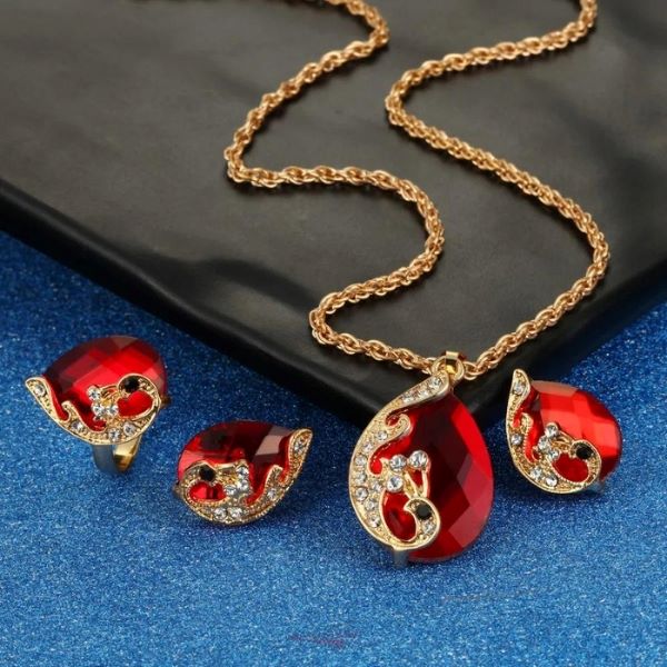 Elegantni komplet rdečih dodatkov vsebuje žensko uro, zapestnico, uhane, prstan in ogrlico, vse iz kakovostnih materialov. 🎁