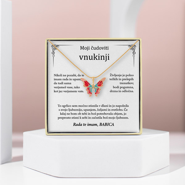 Edinstvena zasnova: Naša ogrlica se ponaša s pisanim obeskom v obliki metulja, ki je eleganten in lep. Postopek kapljanja olja mu vdahne spekter živahnih barv, zaradi česar je prava umetniška stvaritev. 🌈🖌️